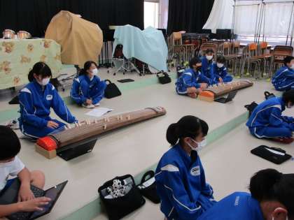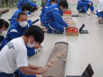 11月25日(金) 1年生(音楽)「さくらさくら(琴)」 公開日 2022/11/25 更新日 2022/11/25 できごと 琴で「さくらさくら」を演奏する練習をしています。琴の演奏は、ほとんどの生徒が初めての体験ですので、皆、緊張気味の表情で一生懸命に練習しています。