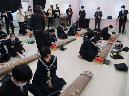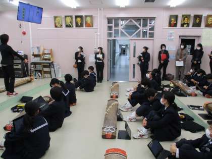 11月29日(火) ICT教育実践推進校 授業公開(1年音楽) 公開日 2022/11/30 更新日 2022/11/30 できごと 1年音楽は,箏曲「さくらさくら」を味わって速度や音色などを工夫して演奏する学習でした。「これまで」で前回のジャムボードを振り返り,「ここでは」で,ジャムボードに個人のアイデアを入れ,試しの演奏をしながらジャムボードにグループの表現の工夫をまとめました。おわりに演奏してみるとはじめと比べて表情のある「さくらさくら」になりました。