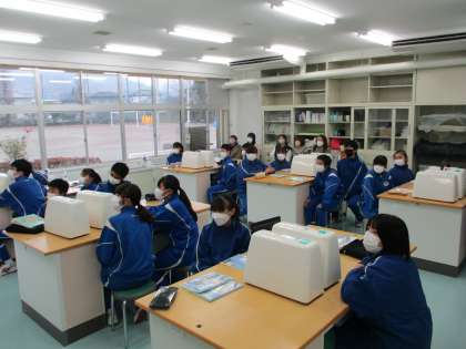 12月6日(火) 2年生(家庭)「エコバッグの製作」 公開日 2022/12/06 更新日 2022/12/06 できごと ミシンを使ってエコバッグを製作しています。今日はミシンボランティアさんにご指導いただいて仕上げの作業です。ポケットを付けて、袋にして、マチを付ける。ボランティアさんにアドバイスいただきながらどんどん作業は進んでいます。
