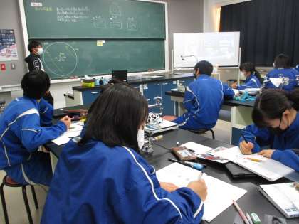 12月9日(金) 3年生(理科)「地球と宇宙」 公開日 2022/12/09 更新日 2022/12/09 できごと 地球は地軸を中心に西から東へ1日に360度(1時間で15度)回転しています。また、北極星側から見て反時計回りに回っています。これを自転といい、太陽や星座をつくる星が1日に360度(1時間で15度)回転しているように見えるのもこの自転によるものです。地球上から見ると、自分が止まっていて星が動いているように見えるので、すぐには理解できない生徒もいるようです。