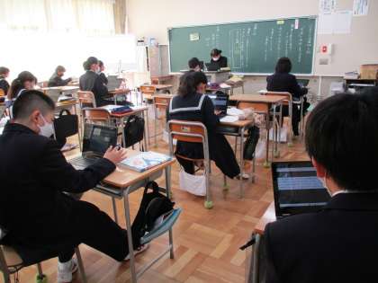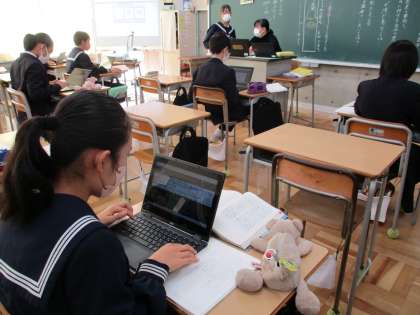 12月12日(月) 1年生(国語)「不便の価値を見つめ直す」 公開日 2022/12/12 更新日 2022/12/12 できごと 筆者が主張する「不便」だからこそ得られるよさ「不便益」についての文章を読み進めています。今日は,筆者の考えを要約して,それに対する自分の考えを書きます。教科書とノートを見ながら,タブレットを使って考えをまとめていきます。みんな集中して黙々と打ち込んでいます。