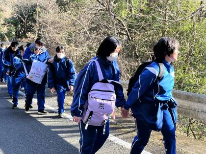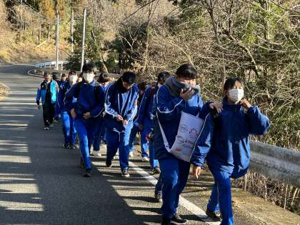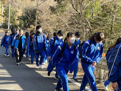 1月13日(金) 2年生立志ウォーク 公開日 2023/01/13 更新日 2023/01/13 できごと 歩き始めて1時間半が経過しました。もう少しで桜山公園です。少し暑くなってきて、上着を脱ぐ生徒もいます。