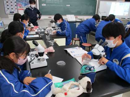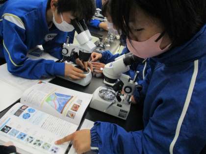 1月24日(火) 1年生(理科)「火山灰に含まれる鉱物を調べよう」 公開日 2023/01/24 更新日 2023/01/24 できごと 1年生は「火山」について学習中です。今日は,火山灰から粒を取り出し,それを顕微鏡で観察しました。うまくいくと粒の色や形の違いがよく分かります。教科書の写真と比べながらどの鉱物かを調べていました。