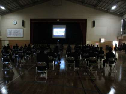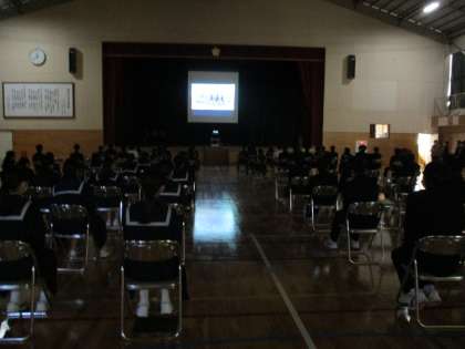 3・4校時は,生徒会主催の「3年生を送る会」が行われました。生徒会本部役員が企画した「鬼石中クイズ」を楽しんだあと,3年生がお世話になった先生方からのビデオメッセージが流されました。懐かしい先生方からの言葉をじっと聞いている3年生の姿が印象的でした。また,3年生から2年生と1年生へのメッセージもありました。