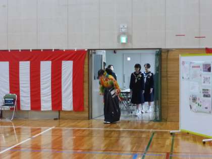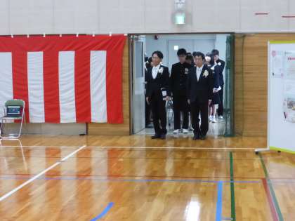3月13日(月) 第37回卒業式3 公開日 2023/03/13 更新日 2023/03/13 できごと 「卒業生入場」という司会からの声とともに扉が開き,卒業生が式場に入場してきました。卒業式のはじまりです。