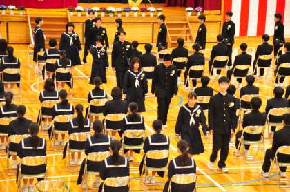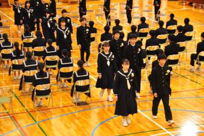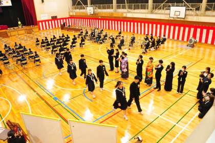 「卒業生退場」という司会の声,「1組起立」「2組起立」の合図とともに,卒業生が式場から退場していきました。卒業式が終了しました。