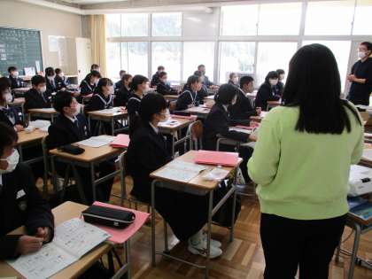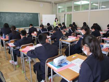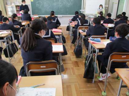 4月13日(木) 1年生(英語)「中学英語のスタート」 公開日 2023/04/14 更新日 2023/04/14 できごと 小学校からの英語学習の継続で,いろいろな表現が身に付いています。教師からの英語の指示にもしっかり答えています。 今日の授業の,前半はアルファベットの確認,後半はフォニックスで発音の練習をしました。