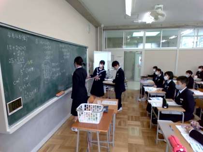4月14日(金) 1年生(数学)「累乗をふくむ因数分解」 公開日 2023/04/16 更新日 2023/04/16 できごと 前回は、整数をいくつかの整数の積の形で表す因数分解を学びました。今日は、指数を使った累乗をふくむ因数分解にもチャレンジです。先生のやり方をしっかり見て、練習することができました。 授業 1年