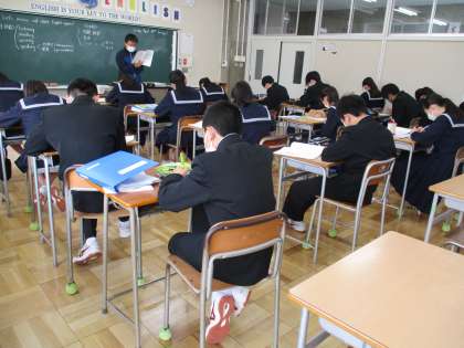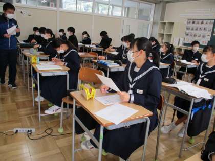 4月14日(金) 3年生(英語)「リスニングタイム」 公開日 2023/04/16 更新日 2023/04/16 できごと 今日はリスニングを中心に練習しました。リスニングは得意な人が多いようで,大まかな内容はよく聞き取れています。繰り返し聞くときには,より細かいところに集中して聞いています。
