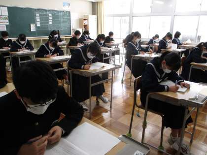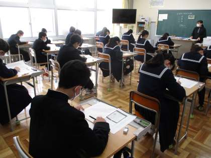 今日は、全国学力学習状況調査の日です。国語、数学、英語の3時間実施されます。生徒は集中して問題に取り組んでいます。