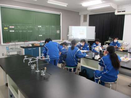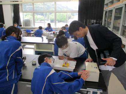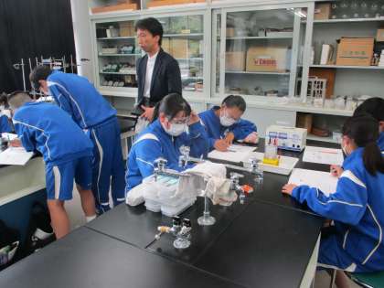 水を電気エネルギーによって分解すると何ができるのか?について予想し、実験をしています。予想では、水素、酸素、窒素、二酸化炭素など、いろいろな意見がありましたが、実際は、、、もちろん水素と、酸素ですが、その発生の割合についてもしっかりと記録して導き出していました。