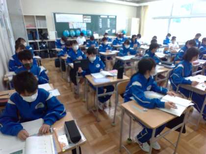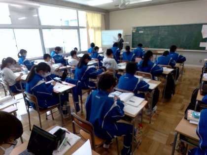 授業の始めでは、これまでに学習した、減法を加法になおして計算する方法を復習しました。前回は2つの数の減法でしたが、今日は3つの数の減法の計算についての学習です。練習問題をして身に付けていきいますが、早く終わった生徒は率先してワークに取り組む姿が見られました。