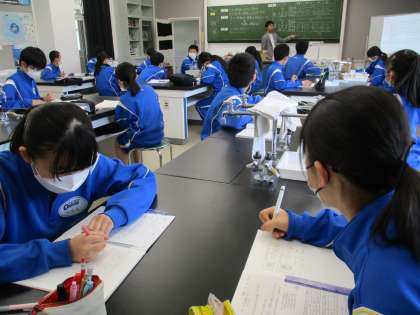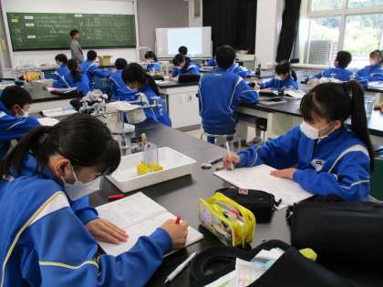 4月27日(木) 3年生(理科)「浮力の大きさは何と関係しているのか」 公開日 2023/05/08 更新日 2023/05/08 できごと 前時の実験から,同じ体積のアルミとアクリルの円柱を水中に沈めると同じ浮力がはたらいていることが分かりました。ということは,浮力は質量には関係なく水中にある体積に関係あるということになります。また,物が浮かぶか沈むかは,浮力と重力の大きさの関係で決まり,また密度でも決まる,ということも分かりました。おもしろいですね。