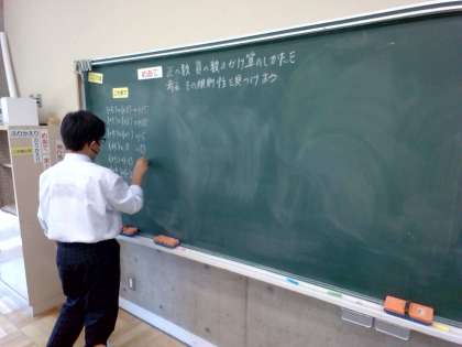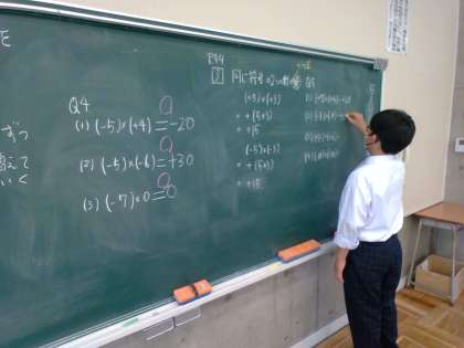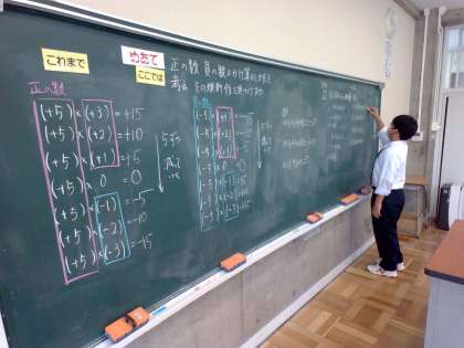 5月11日(木) 1年生(数学)「正の数、負の数のかけ算の規則を見つけよう」 公開日 2023/05/12 更新日 2023/05/12 できごと これまでに学んだ、正の数にある数をかける計算を確認した後、負の数にある数をかける乗法を考えました。その中で、同じ符号の2つの数の積と、異なる符号の2つの数の積の、規則を見つけることができました。では、小学校で学んだかけ算と同じように、交換のきまりや結合のきまりが成り立つのでしょうか。このあと学習していきます。 授業 1年