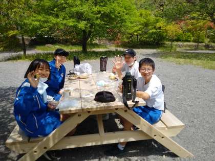 みんな話ながら場所を決めて座ります。お弁当を広げて笑顔です。