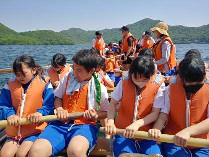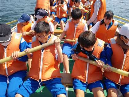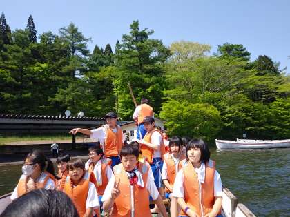 5月18日(木) 1年生 榛名カッター実習編 3 公開日 2023/05/18 更新日 2023/05/18 1年高原学校 全員が乗り込んで、いよいよ桟橋から離れます。はじめはなかなかうまくいきませんが、声をかけあって少しずつ進みます。 行事