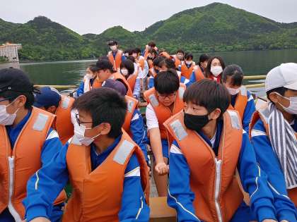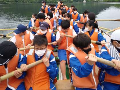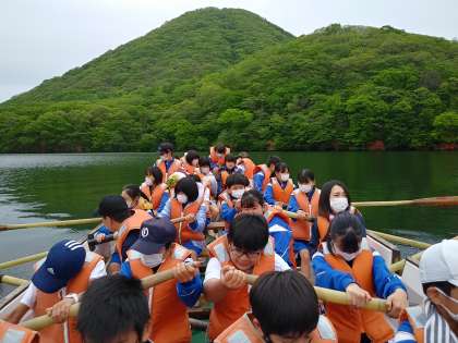 5月19日(金) 1年生カッター実習2日目編4 公開日 2023/05/19 更新日 2023/05/19 1年高原学校 どんどん上手になってすいすい進みます。榛名富士がすぐそこに迫っています。すごいです。