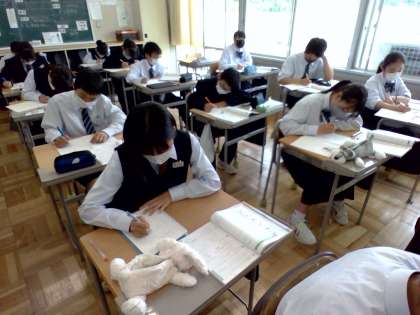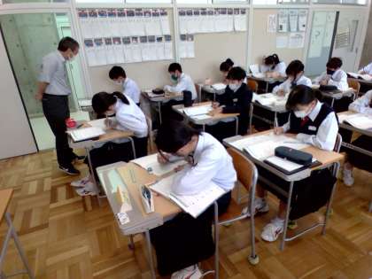 5月22日(月) 1年生(数学)「四則の混じった式の計算」 公開日 2023/05/23 更新日 2023/05/23 できごと これまでに、乗法と除法の混じった式は、乗法だけの式になおすと、乗法の交換法則や結合法則を使って計算することができることを学びました。今日は、加減乗除の混じった式の計算のしかたについて考えます。小学校の算数と同じように、かけ算、わり算を先に計算するんですね。その後、カッコのある式や累乗のある式についても学習しました。 授業 1年