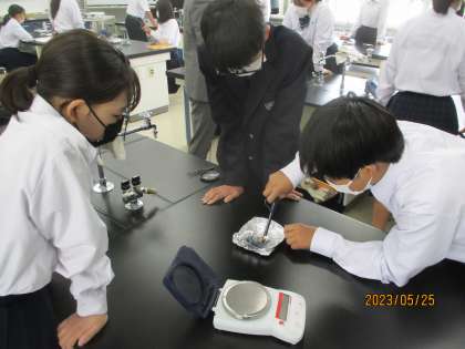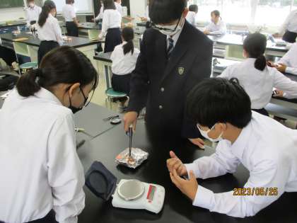 5月25日(木) 2年生(理科)「マグネシウムの燃焼」 公開日 2023/05/25 更新日 2023/05/25 できごと 金属であるマグネシウムを燃焼させるとき、その質量はどのように変化するのか?これまでに実験を通して学習してきた,有機物の燃焼などを参考に予想をし、実験しました。 多くの生徒は、燃焼したマグネシウムの質量が増加していることに驚いている様子でした。