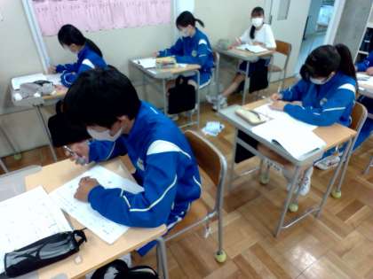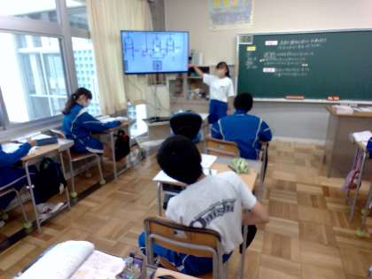6月2日(金) 3年生(理科)「仕事の原理」 公開日 2023/06/04 更新日 2023/06/04 できごと 道具を使った場合と道具を使わなかった場合、その仕事の大きさはどうなるのでしょうか。前回の実験結果から考察すると、動滑車(道具)を使った場合、ものを持ち上げる力は半分になる代わりに、引き上げる距離が倍になることから、仕事の大きさは変わらないことが考えられます。仕事の原理を基に、色々な場合の仕事について考えました。 授業 3年