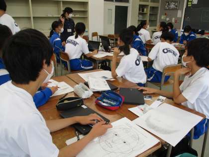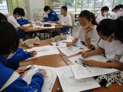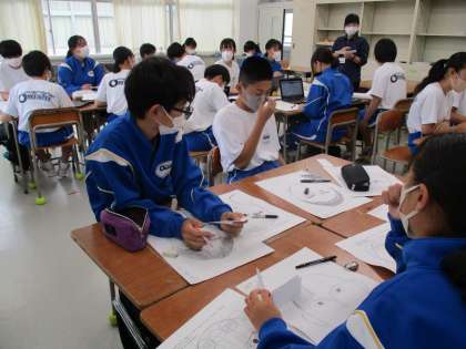 6月7日(水) 2年生(美術)「自分を描こう」 公開日 2023/06/12 更新日 2023/06/12 できごと 自分の顔を描いています。顔の基本的なバランスを参考にしながら,自分の顔をよく見てスケッチしています。なかなか難しそうですが,丁寧に取り組んでいます。