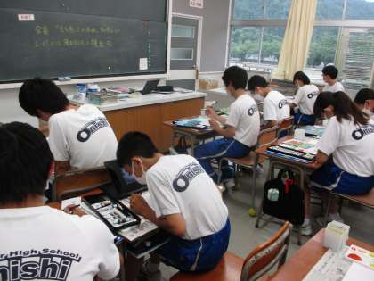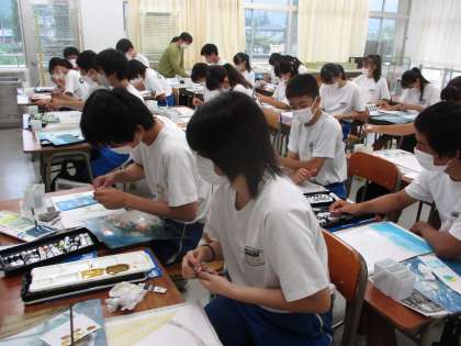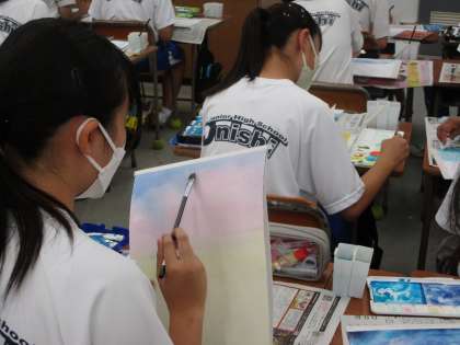 7月5日(水) 3年生(美術)「光を感じる水彩画」 公開日 2023/07/05 更新日 2023/07/05 できごと 思い思いのイメージをもって制作に取り組んでいました。淡い色使いのものが多く、にじませる技法を使ったりしながら真剣に彩色していました。