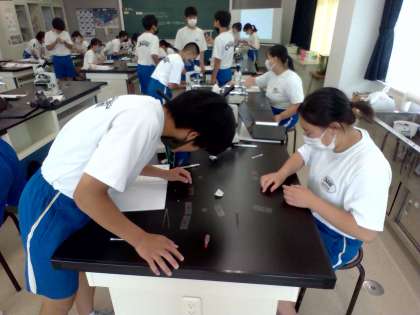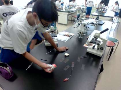 7月5日(水) 2年生(理科)「生物の体をつくっているもの」 公開日 2023/07/10 更新日 2023/07/10 できごと これまでに、植物やヒトの体について学習してきました。今日は、生物の体をつくっているものは何か、植物と動物の細胞を観察し、共通点を探していきました。染色液を使うと細胞の中に丸いものが見えることが分かりました。このあと、植物と動物のつくりの相違点や共通点について考えていきます。 授業 2年