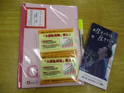 社会を明るくする運動とは,地域の犯罪や非行を防止し,安全で安心な明るい地域社会を築くための運動です。毎年,推進委員の方々が各中学校を巡回し,懇談会を行っています。今年も,保護司の皆さんや更生保護女性会の皆さんから,リーフレットや啓発のグッズを全校生徒と職員にいただきました。運動の趣旨を理解し,社会を明るく,よい鬼石中にしていけるように,がんばっていきます。