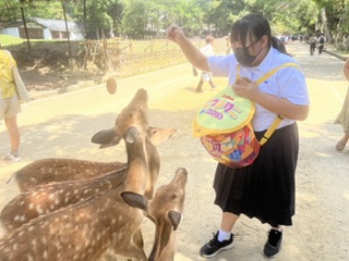 奈良公園の中で鹿と戯れている班を発見。
