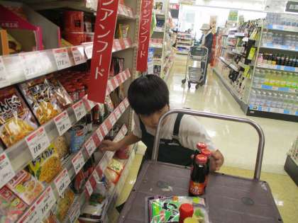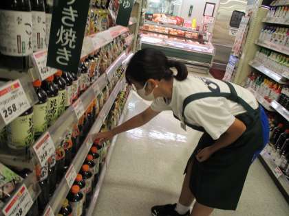 フレッセイで販売業の体験をしている生徒の様子です。名札をもらい、説明を受けたら、さっそく店内で品出しの作業開始です。黙々と作業を進めていました。
