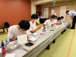 手鏡、ペン立て、小物入れに、京都の伝統工芸である加飾を施します。皆、いつになく真剣な表情ですね。