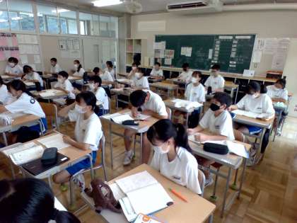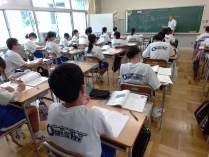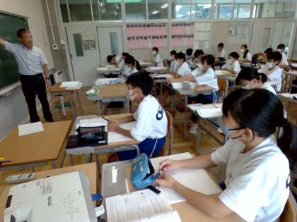 9月11日(月) 1年生(数学)「かっこのある1次方程式の解き方」 公開日 2023/09/12 更新日 2023/09/12 できごと これまで、1次方程式の解き方を学んできています。ここでは、かっこのある1次方程式の解き方について考えます。かっこがある式では、これまでに学習した分配法則が使えそうです。方程式は、イコールの位置をそろえて計算すると見やすくなって、間違いが減ることが分かりました。 授業 1年