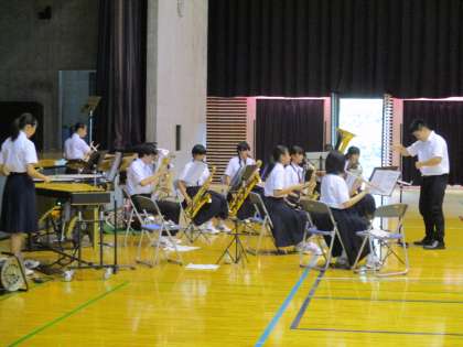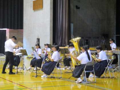9月10日(日) 中里中学校吹奏楽部定期演奏会に参加 公開日 2023/09/11 更新日 2023/09/11 できごと 鬼石中学校と中里中学校は,合同バンドとしてコンクールに出場しました。8月の鬼石中学校定期演奏会には中里中学校吹奏楽部の皆さんが参加してくれました。今日は中里中学校定期演奏会に鬼石中学校吹奏楽部が参加して,コンクールの曲を演奏しました。久しぶりの合奏でしたが,息もぴったりで,美しいハーモニーが中里中学校の体育館に響きました。
