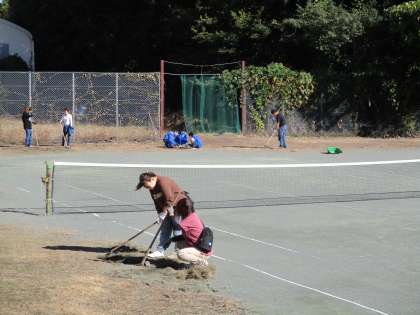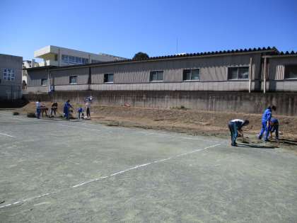 1年生の保護者や生徒を中心に,テニスコートの整備をしていただきました。草取りや土表面の苔取りをしていただき,よい状態になりました。