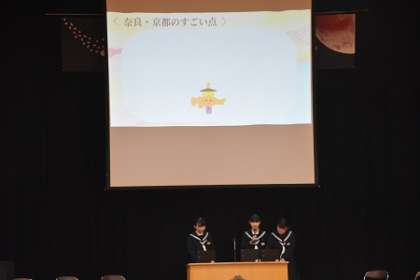 3年生は,総合的な学習の時間に,鬼石の活性化について考えてきました。修学旅行で訪ねた京都や奈良のまちづくりから学んだことをもとに,鬼石の未来をどう創っていったらよいかを考え,発表しました。いろいろなアイデアが出されました。