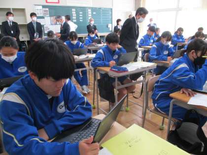 11月6日(月) 教育委員学校訪問 2年生(国語)「平家物語」 公開日 2023/11/08 更新日 2023/11/08 できごと 2年生の授業参観は国語でした。「平家物語」より「扇の的」を読んでいます。那須与一など登場する人物たちの言動から分かる,ものの見方や考え方を知ることがめあてです。そして,それに対する自分の考えをまとめて互いに共有して深めていきます。緊迫する場面をイメージしてみんなじっくり考えている様子でした。