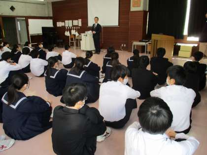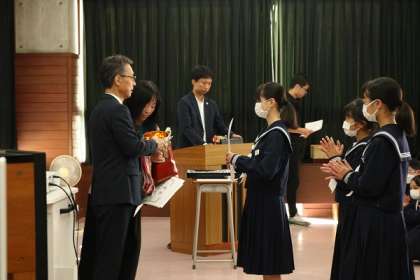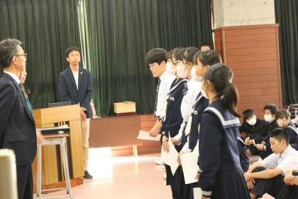 10月17日(火) 任命式(生徒会本部役員) 公開日 2023/11/14 更新日 2023/11/14 できごと 生徒会本部役員選挙で新役員に選ばれた5名の任命式が行われました。ランチルームに全校生徒が集まり,しんと静まった中で,新役員は引き締まった表情で校長先生から任命書を受け取りました。桜華祭で新旧役員の引継が行われます。 あわせて,2学期に入っていろいろなところで活躍した生徒の皆さんの表彰も行いました。それぞれのもてる力を発揮してがんばっています。