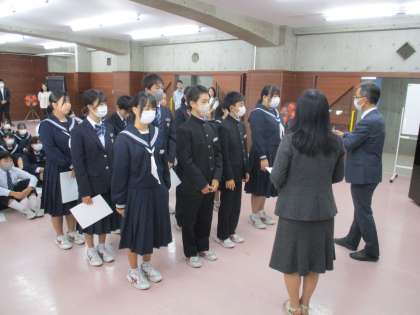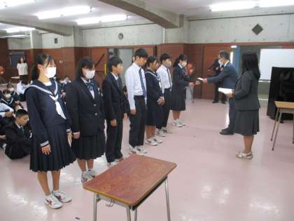 生徒会本部役員の任命式は桜華祭の前に行いましたが,生徒会専門委員会委員長と後期学級役員の任命式が行われました。校長先生から任命書を受け取り,リーダーの責務をあらためて自覚しました。それぞれの活躍が期待されます。