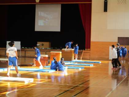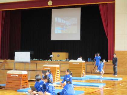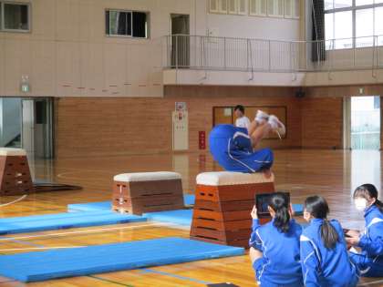 11月13日(月) 2年生(体育)「とび箱」 公開日 2023/11/14 更新日 2023/11/14 できごと 先週から始めた跳び箱ですが,今日は,より高い跳び箱に挑戦したり,さらに美しく飛んだり回ったりできるように,自分で考えて取り組んでいました。途中,タブレットで撮影し合い,自分の試技を振り返りながら,練習を重ねていました。