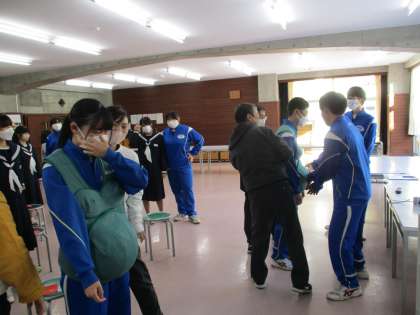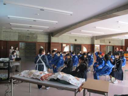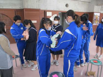 市の健やか未来部の出前講座として,助産師さんや保健師さんを講師に迎え,3年生が命の大切さについて学びました。驚異的な確率で生まれてきた私たちは生きていく力をもっていること,家族をはじめたくさんの愛情を受けて育ってきていること,命を守っていかなければならないこと,など,医学的な根拠を踏まえてお話がありました。さらに,妊婦体験をしたり,乳児の人形を使って抱っこの体験をしたり,貴重な体験もできました。いろいろなことを考えるよい機会になりました。