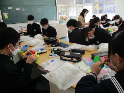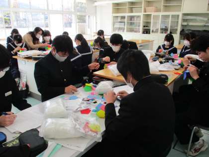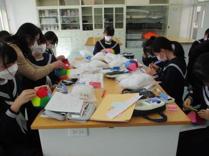 11月21日(火) 3年生(家庭科)「幼児のおもちゃ作り」 公開日 2023/11/26 更新日 2023/11/26 できごと 幼児のおもちゃとしてやわらかいボールを作っています。いよいよ仕上げです。中に綿を入れて閉じて,ミニサッカーボールができてきました。来月のこども園訪問に持って行く予定です。楽しみです。