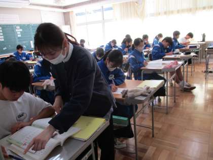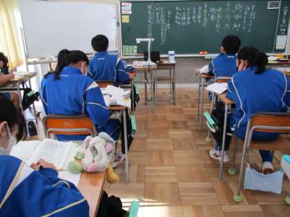 11月20日(月) 2年生(国語)「漢詩」 公開日 2023/11/26 更新日 2023/11/26 できごと 古典の学習が進んでいます。日本の古典に続いて中国の漢詩の学習です。1年時に学習した,漢文の読み方を復習してから,有名な孟浩然の「春暁」から味わいます。リズムよく読めています。