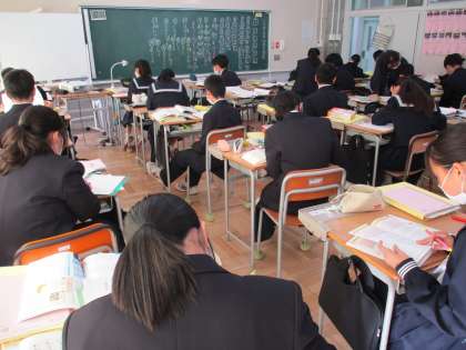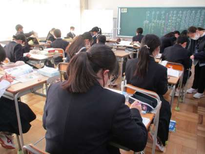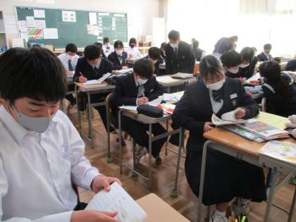 古典の学習が進んでいます。日本語の中には中国の古典に由来する言葉も多くあります。“矛盾”“推敲”“蛇足”などの故事成語の意味や由来を調べていきます。同時に,漢文の読み方も練習していきますが,ルールを知り,どんな順に読んでいったらよいのかを考え,なかなか難しそうです。