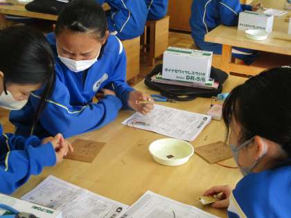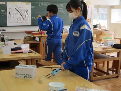 1月23日(火) 2年生(技術)「ダイナモワイヤレスラジオの製作」 公開日 2024/01/23 更新日 2024/01/23 できごと これから、はんだごてを使ってラジオの製作が始まりますが、その前に、電子部品である発光ダイオードの実験をするそうです。