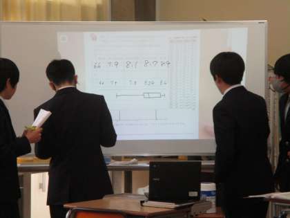 3月6日(水) 2年生(数学)「ヒストグラム」 公開日 2024/03/06 更新日 2024/03/06 できごと 今日はヒストグラムの学習をしていました。昨日学習した、箱ひげ図と比較してメリットやデメリットは?