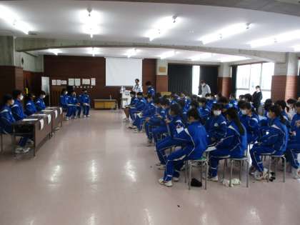 3月8日(金) 3年生の話を聞く会 公開日 2024/03/08 更新日 2024/03/08 できごと 3年生の代表者4名が、1・2年生に話をしました。内容は、どのように受験期を乗り越えてきたかということです。例えば、勉強を毎日どのくらいの時間していたか?勉強のコツは?志願先をどのように決めたのか?など、4人ともそれぞれの考えを述べてくれたのでとても参考になる内容でした。