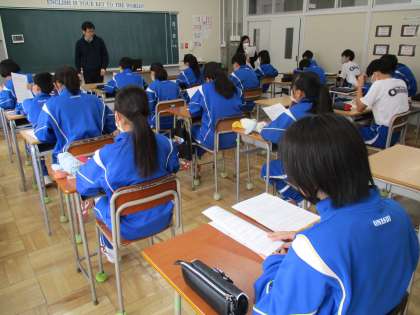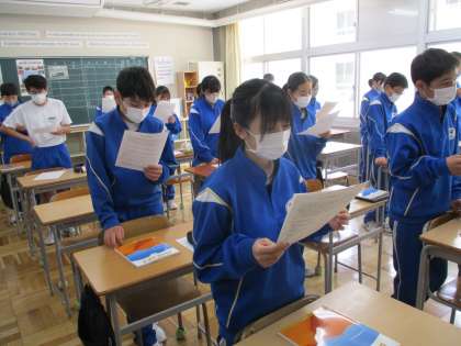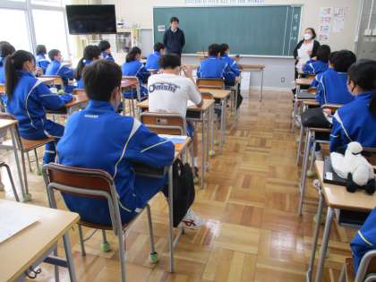4月11日(木) 2年生(英語)「オリエンテーション」 公開日 2024/04/14 更新日 2024/04/14 できごと 2年生の英語では,オリエンテーションが行われていました。1年生の英語の学習を振り返りながら,2年生で身に付けたいことを確認しました。英文を声に出して読む活動では元気な声が出ていました。