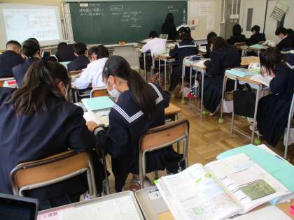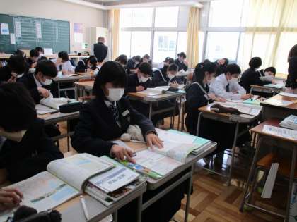 4月15日(月) 2年生(社会)「地形図をマスターしよう」 公開日 2024/04/16 更新日 2024/04/16 できごと 2年生は,地理の学習から始まりました。地形図の基礎知識をマスターすることがめあてです。縮尺,等高線,地図記号などを思い出しながら,地形図を読みました。難しいところは友達と協力して進めていきます。