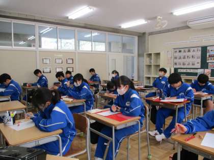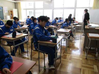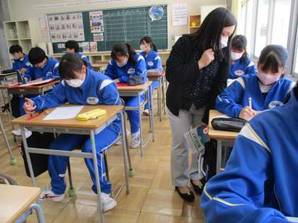 4月15日(月) 3年生(英語)「過去分詞形の復習」 公開日 2024/04/16 更新日 2024/04/16 できごと 2年生の最後に学習した「受け身」の文には動詞の過去分詞形を使います。3年生の最初に学習する「現在完了形」の文にも動詞の過去分詞形を使います。そこで,教科書巻末の動詞の活用形のページを使って,過去分詞形の総復習をしました。