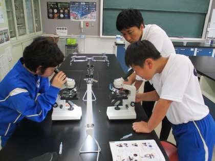 5月1日(水) 1年生(理科)「水中の生物を調べよう」 公開日 2024/05/07 更新日 2024/05/07 できごと 池の水にいる生物を調べるために,顕微鏡の使い方を学習しました。 まずスポイトで採取した水をたらしてプレパラートをつくり,ステージにのせ,対物レンズを近づけ,接眼レンズをのぞきながら対物レンズを離してピントを合わせます。「何か動いています。」「倍率を高くしてみよう。」「丸いものが見えます。」わくわくが止まりません。